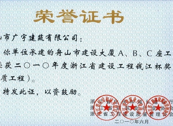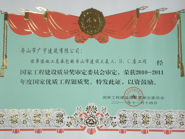 2010-2011年度國家優(yōu)質(zhì)工程獎(jiǎng)銀質(zhì)獎(jiǎng)(舟山建設(shè)大廈C座)
